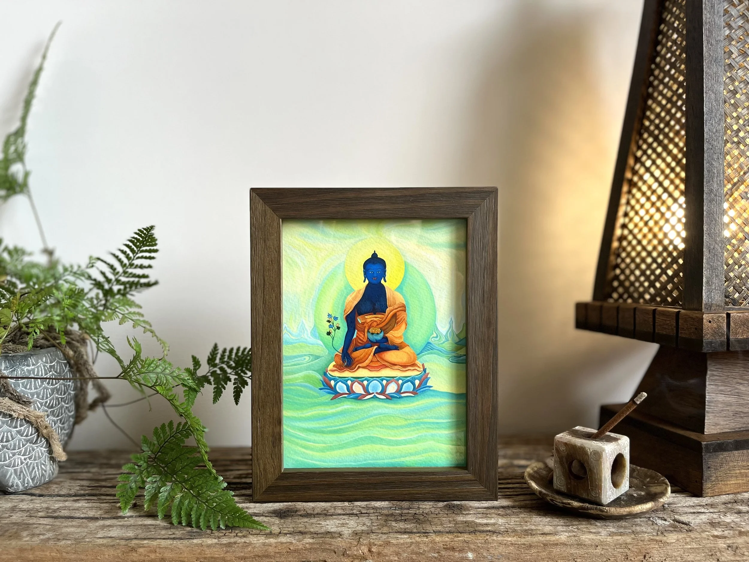 從2020年始,因緣開始接觸佛繪,繪時感悟,對繪畫佛像很熟悉。一路跟著緣分與內在的信任,繪製許多揚升大師們;從綠度母、濕婆神、千手千眼觀世音菩薩,到藥師琉璃光如來—藥師佛,一路上我的內外體驗也在蛻變、更新。