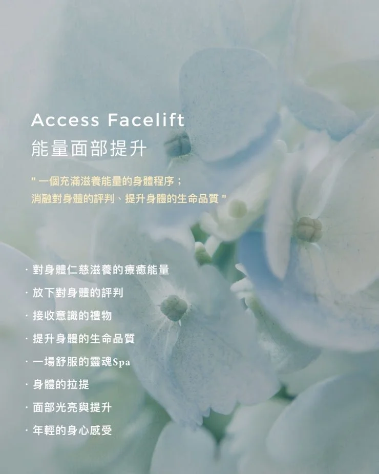 在Access 面部拉提高能量的運行過程中,我們同時學習著如何接收與給予,並且以更輕鬆、更溫柔慈悲的方式滋養我們的身體。