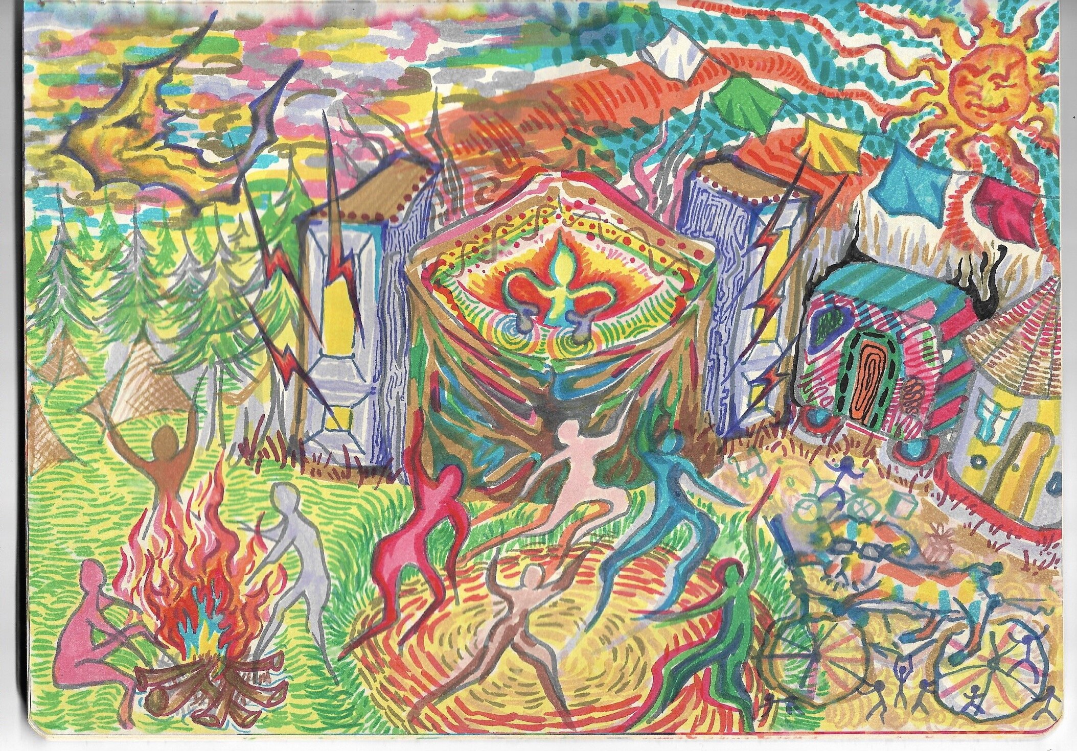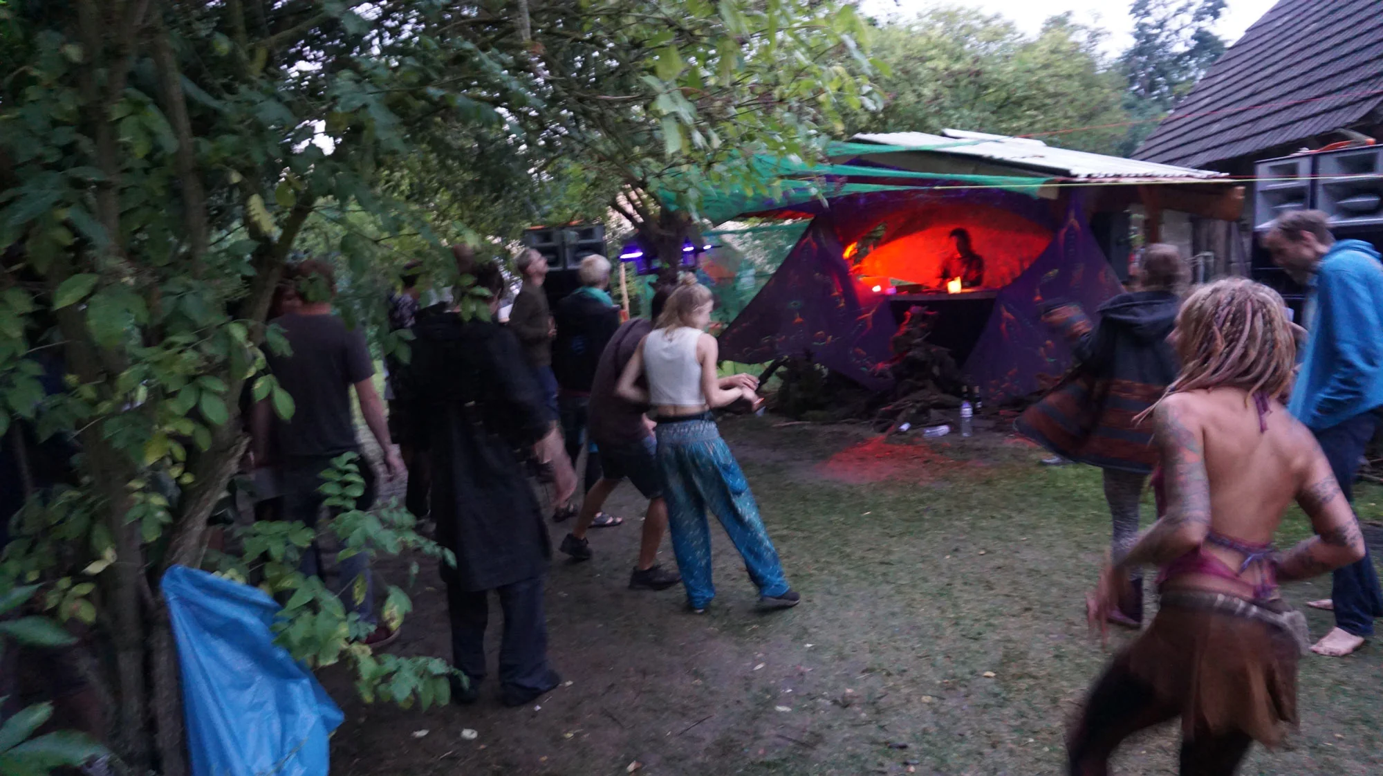 Forest, bonfire, trailer, bike and dancing peoples, a secret gathering in Germany.